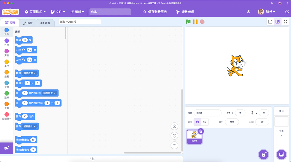- 编程区:界面中央的空白区域,用于拖拽积木组合代码,实现角色或背景的交互逻辑。